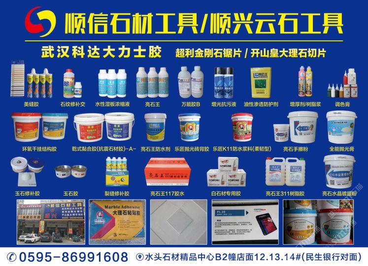南安市順信石材工具有限公司成立于1999年,位于有“中國石材城”之稱的福建省南安市水頭鎮(zhèn)閩南建材市場內(nèi),分設石材工具護理部、干掛部兩個門市部,是一家批發(fā)、零售兼營的石材配套工具。多年來,憑借產(chǎn)品的齊全、質(zhì)量的保證、信譽的可靠、服務的周到,本商行在國內(nèi)同行中已形成自己的地位和影響,并擁有龐大的客戶群體,產(chǎn)品銷至國內(nèi)各大石材生產(chǎn)基地。我們代理的品牌有:武漢科達大力士膠、環(huán)氧膠、化學錨栓、干掛膠、植筋膠等產(chǎn)品系列;亮石王防護劑、防古水、水晶膠、樹脂膠、友豐比利蠟等產(chǎn)品;粵邦消紋劑、染色劑、百亮鋼絲棉、百潔墊;旗魚、非爾、柏興、順輝、背栓螺絲;各種款式干掛件、幕墻材料輔助產(chǎn)品;磨料磨具品牌有益和、超利、順興、閩福、芒果、金山、金鋒、智輝等;進口、國產(chǎn)防古刷、亞光磨料、大理石磨料;意大利開山皇大理石刀具、微晶石刀具、電鍍切片、超利金鋼石切割片、軟磨片、翻新片、金鋼盤、樹脂盤;大小規(guī)格刀具、鉆頭、雕刻工具齊全;金鋼石異形輪、石材夾具、吊具、吊繩、勞保用品;電動工具、氣動工具、銅條、鋼條、合金工具等各種各樣產(chǎn)品齊全。