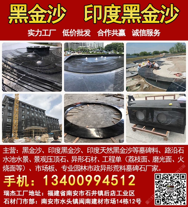 發(fā)布信息: 瑞杰黑金沙林總13400994512專業(yè)印度黑金沙供應商,實力石材工廠主要加工:黑金沙、黑金砂、印度黑金沙、印度天然黑金沙、印度黑色石材、印度黑石、黑金沙石材、黑金沙花崗巖、新礦黑金砂、國產(chǎn)黑金沙、新黑金沙石材等墓碑料、路沿石、水池水景、景觀壓頂石、異形石材、工程單(荔枝面、磨光面、火燒面等)、市場板、專業(yè)園林市政異形荒料墓碑石廠家,實力工廠、低價批發(fā)、合作共贏、誠信服務. 工廠地址:福建省南安市石井鎮(zhèn)后店工業(yè)區(qū),門市部:南安市水頭鎮(zhèn)閩南建材市場