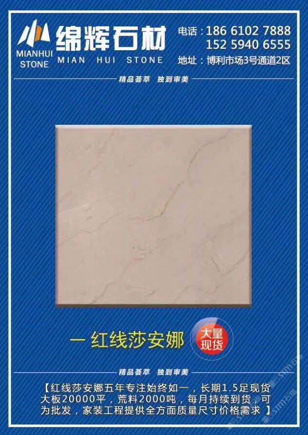 發(fā)布信息: 綿輝石材 主營:《紅線莎安娜》《美尼斯灰·新古堡灰》 ??長期現(xiàn)貨兩萬平走量不走價(jià),超值特惠90元起?? [發(fā)]另有2600平《金歐典》品種清倉揮淚甩賣[發(fā)] 致富熱線:13004819222李