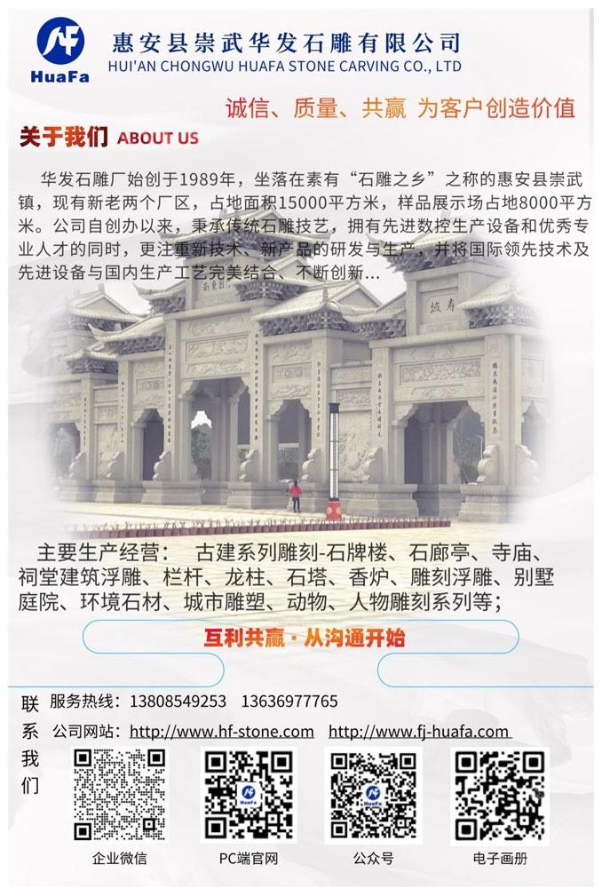 惠安縣崇武華發(fā)石雕有限公司 聯(lián)系人:劉喜洋    138****9253 查看 159****3722 查看 主營(yíng)范圍: 石材雕刻、石材工藝品、花崗巖加工、異型加工、石材工程資質(zhì)企業(yè)、 企業(yè)地址:福建泉州惠安縣S312(惠崇公路)華發(fā)石雕