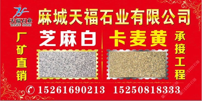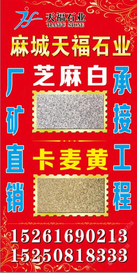 發(fā)布信息: 天福石業(yè)【主營經(jīng)營】芝麻白(603#)、卡麥黃.602#.芝麻灰、銹石、黃金麻、卡拉麥里金·毛板、光板、火燒板,荔枝面成品板及臺階石、蘑菇石~路沿石、擋車石,圓球.圓柱.異形、仿形加工工藝品等。適合用于各種場合, 優(yōu)質(zhì)礦山資源以質(zhì)量求生存、以信譽(yù)求發(fā)展。聯(lián)系電話:15250818333