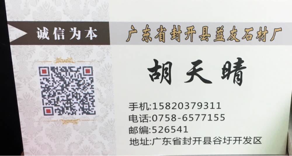 廣東省肇慶市益友石材廠 聯(lián)系人:胡天晴    158****9311 查看 手機(jī)號(hào)碼:無(wú) 主營(yíng)范圍: 花崗巖加工、荒料、大板批發(fā)、石材交易市場(chǎng)、 企業(yè)地址:廣東肇慶封開(kāi)縣S266兩廣石材交易市場(chǎng)