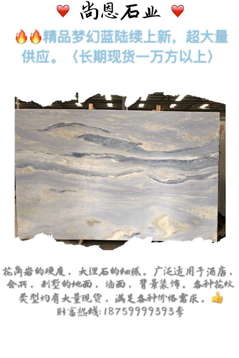 發(fā)布信息: ?? 藍(lán)色blue?永不凋零的奢華! ?巴西輕奢石【夢(mèng)幻藍(lán)】【藍(lán)水晶】【藍(lán)天白云】 ??礦山直銷(xiāo)批發(fā)產(chǎn)品,價(jià)格,奢享從未如此簡(jiǎn)單,量大更優(yōu)惠。 ??藍(lán)色一直是高端別墅,酒店,會(huì)所裝飾色調(diào)。各種紋路,各種底色應(yīng)有盡有,任您挑選。期待與您的合作[耶] ??:18759999393李 地址:鵬翔石材城主通道F9