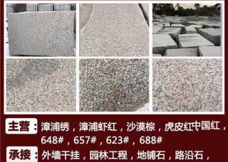 聯豐石材二廠主營產品:G681,銹石,G606(副礦),漳浦紅G648,漳浦蝦紅,黃銹石,古典灰麻,港尾銹石(荔枝面),港尾銹石(光面),漳浦銹(荔枝面),漳浦銹(火燒面),黃金鉆1,芝麻白G623,白麻企業(yè)地址:福建南安石井鎮(zhèn)聯豐埭頭高速橋旁。
